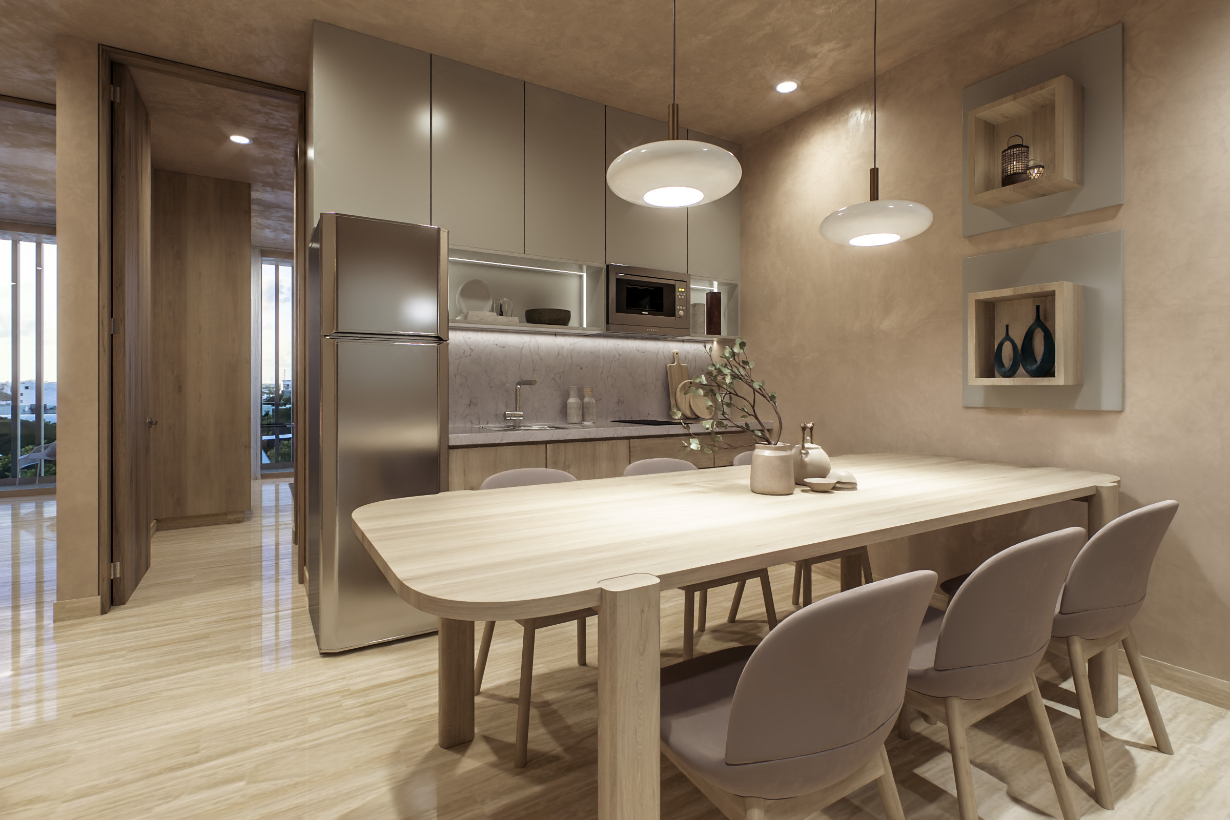 Acabados Premium Pisos: Presenta Pisos de mármol. Cocina: Cocina con cubierta de granito. Equipamiento y Climatización Refrigerador: Incluye un Refrigerador de 12 ft3. Climatización: Dispone de Mini split con conectividad Wi-Fi.